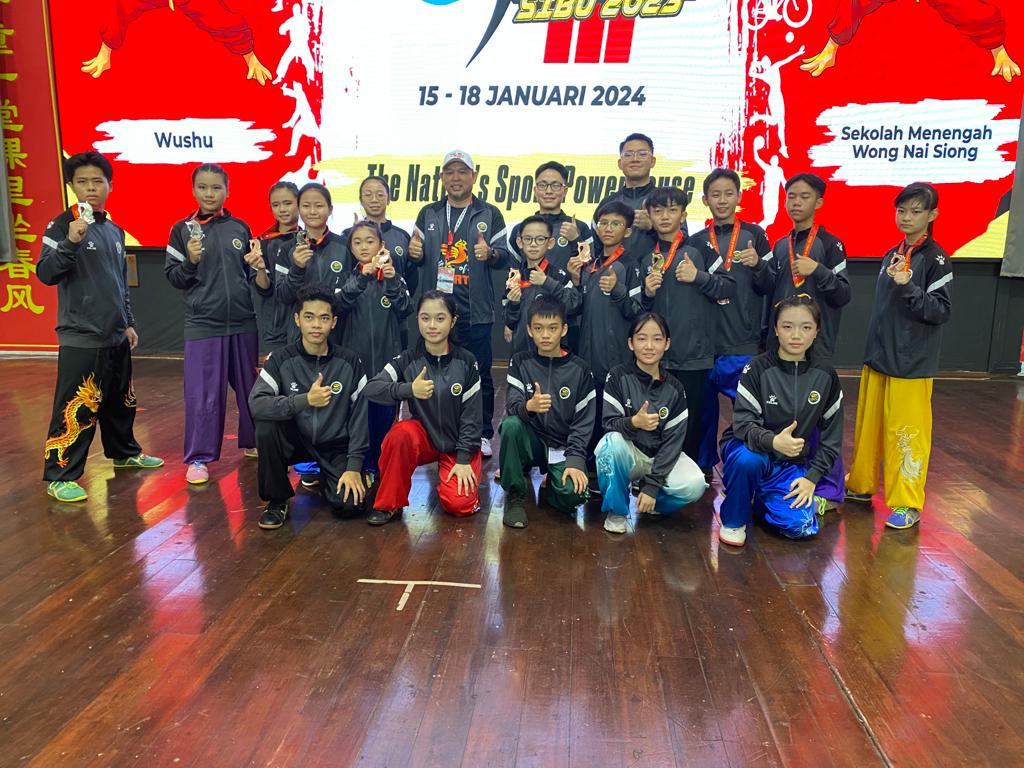 Northern Zone exponents celebrate with Nortern Zone assistant chef-de-mission cum Bintulu Deputy Resident Abang Zainuddin (second left, back row) and (from right), wushu team manager Wong Bik Han and coaches Jong Chin Han and Tan Kai Sing after the prize presentation. |