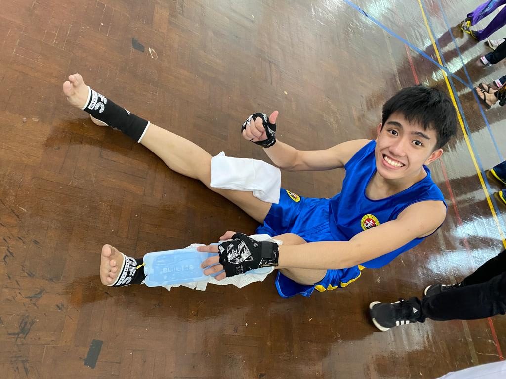 A delighted Hiu after winning despite suffering minor injuries on the left leg during the final bout. |